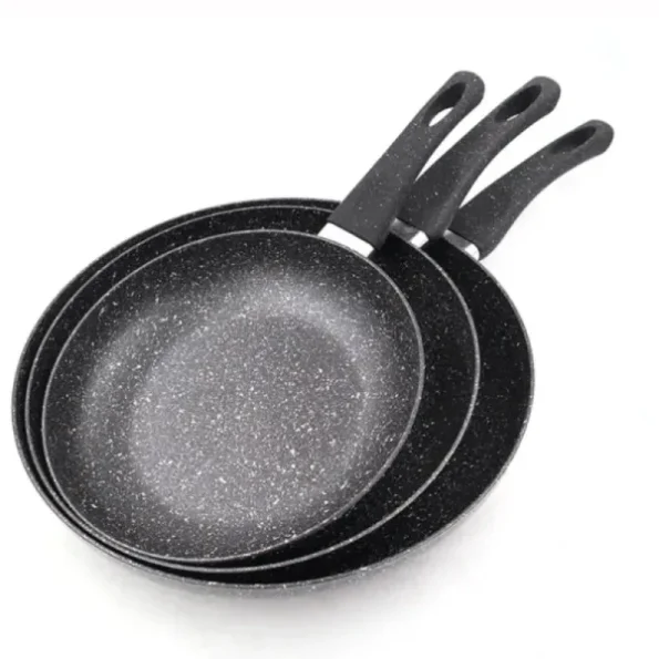 A three-size frying pan made of granite is likely referring to a frying pan that comes in a set of three different sizes, and the cooking surface is either coated with or made of a granite-like material. Granite-coated cookware, or pans with a granite finish, have become popular due to their non-stick properties, durability, and aesthetically appealing look. These pans are typically made from aluminum or another metal and then coated with a layer that mimics granite’s appearance.