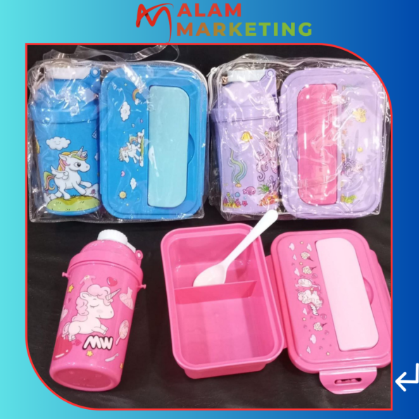 الأطفال وعلبة الطعام + زجاجة الماء بأسلوب كرتوني