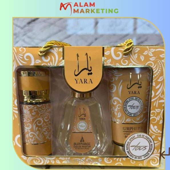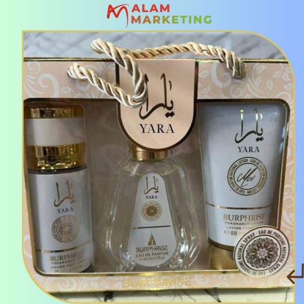 - Crème Yara : Une crème hydratante ou nourrissante pour la peau, qui pourrait être conçue pour apporter douceur et éclat, tout en complétant l’arôme du parfum.